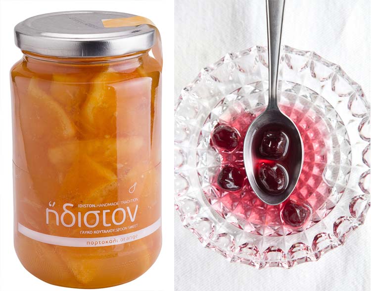 A truly Greek, thick yogurt and two very interesting cheeses: the creamy manouri, and an aged graviera from Naxos island are part of the dessert plate, along with three traditional ‘spoon sweets’ (fruit preserves). They are made every season using the best available produce; the fruits are cooked simply with sugar and lemon juice to thicken the syrup, following the time-honored technique of our grandmothers and mothers. We chose two of the most popular preserves, quince and sour cherry, and added the fragrant rolled bergamot peel, known to most of you as the citrus fruit that gives Earl Gray tea its haunting aroma.