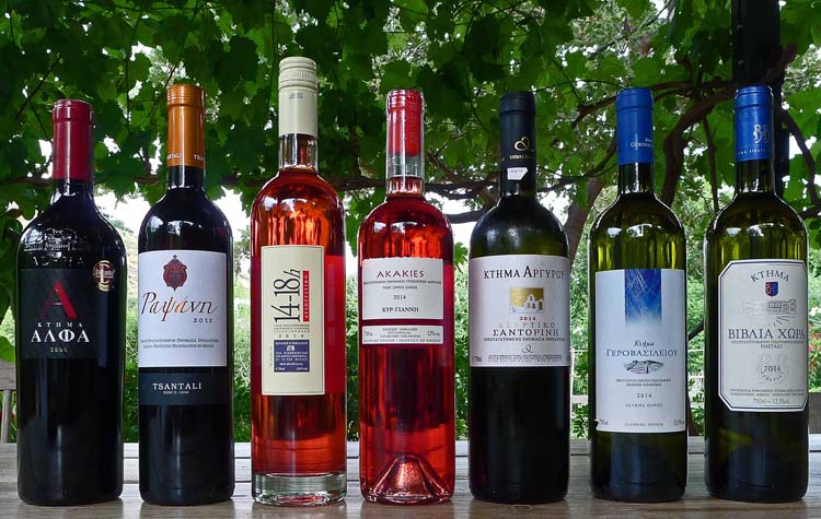 The exquisite wines that accompany the lunch (photographed on our table, on Kea):Alpha Estate red, Tsantali Rapsani Reserve red, Gaia 14-18h rose, Kir Yianni Akakies rose, Argyros Assyrtiko, Domaine Gerovassiliou white, Biblia Chora white. Thanks to Sophia Perpera for her invaluable help, and to all the winemakers for their generous offer!